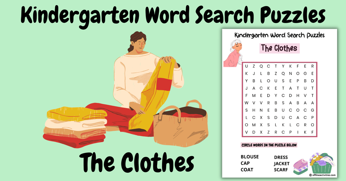 Looking for a fun and free activity for your kindergarteners? Download and print this clothes word search puzzle! featuring hidden words such as shirt, dress, shoes, jacket, and pants.