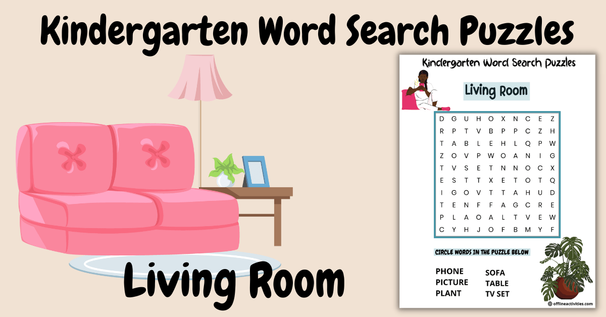 Kindergarten Word Search Puzzles – Living Room is a fun and educational way for kids to study and practice living room objects, items, and furniture. The object of the game is to find all of the words hidden in the grid. The words can be forwards, backward, horizontal, or vertical.