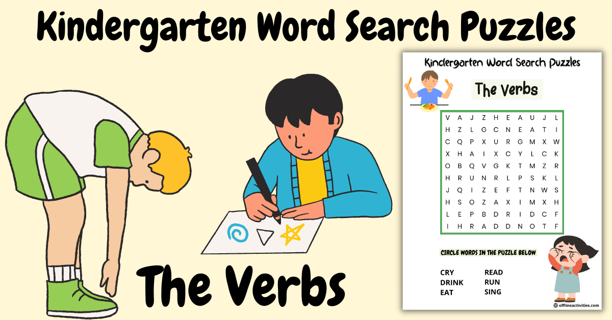 Word Search Puzzles are a great way for kindergarteners to learn about verbs. This puzzle features a range of different verbs. Kids can search horizontally, vertically, and diagonally to find all the words.